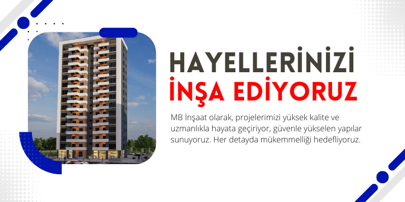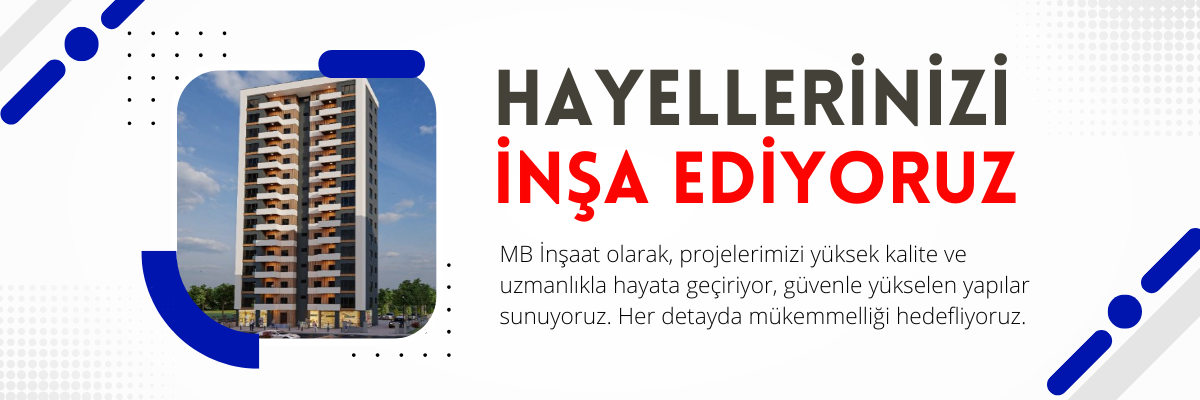 2005 yılından bu yana dinamik yapısıyla sürekli büyüyen MB İnşaat, güçlü finansal yapısı ve toplam kalite anlayışı ile birçok başarılı projeye imza atmıştır. İnsanı merkezine alan, yüksek kaliteye ve çağdaşlığa önem veren MB İnşaat, bugüne kadar konut, yurt binaları ve endüstriyel tesisler gibi çeşitli projeleri anahtar teslim olarak tamamlamıştır.